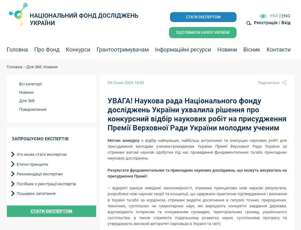 Наукова рада Національного фонду досліджень України ухвалила рішення про конкурсний відбір наукових робіт на присудження Премії Верховної Ради України молодим ученим