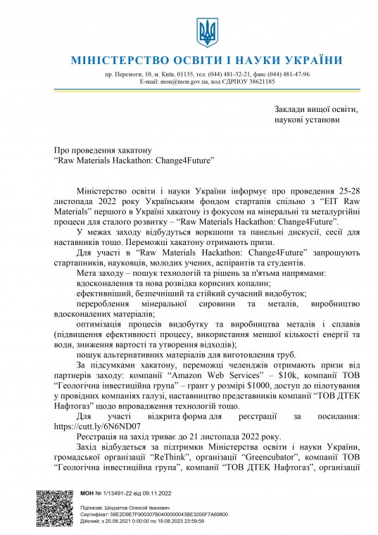 Міністерство освіти і науки України інформує про проведення 25-28 листопада 2022 року Українським фондом стартапів спільно з “EIT Raw Materials” першого в Україні хакатону із фокусом на мінеральні та металургійні процеси для сталого розвитку – “Raw Materials Hackathon: Change4Future”.