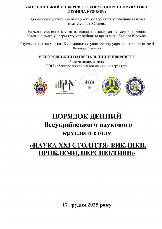 Порядок денний Всеукраїнського наукового круглого столу «НАУКА ХХІ СТОЛІТТЯ: ВИКЛИКИ, ПРОБЛЕМИ, ПЕРСПЕКТИВИ», 17 грудня 2025 року о 10:00