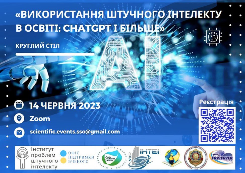 14 червня 2023 року буде проведено круглий стіл на тему «Використання штучного інтелекту в освіті: CHATGPT і більше» для обговорення перспективних підходів до застосування технологій штучного інтелекту в освіті.