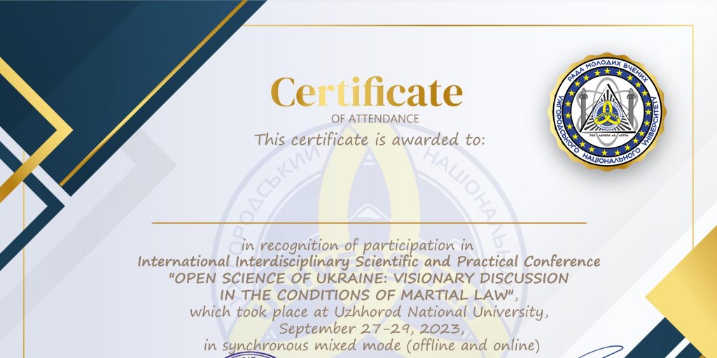 To the attention of the participants dear participants of the Interdisciplinary Scientific and Practical Conference "OPEN SCIENCE OF UKRAINE: A VISIONARY DISCOURSE IN THE CONTEXT OF WARTIME", which took place at Uzhhorod National University in a mixed mode (online and offline), September 27-29, 2023.