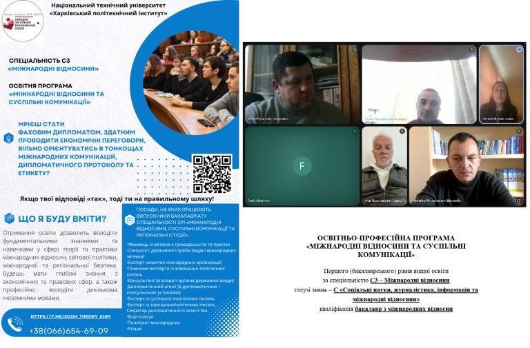 З огляду на це, нещодавно відбулася зустріч між представниками кафедри міжнародних студій та суспільних комунікацій ФІМВ та кафедри загальної економічної теорії Національного технічного університету «Харківський політехнічний інститут», які відповідають за підготовку спеціалістів першого (бакалаврського) рівня вищої освіти за спеціальністю С3 – Міжнародні відносини, галузі знань C – «Соціальні науки, журналістика, інформація та міжнародні відносини», за участі стейкхолдерів та студентської спільности.
