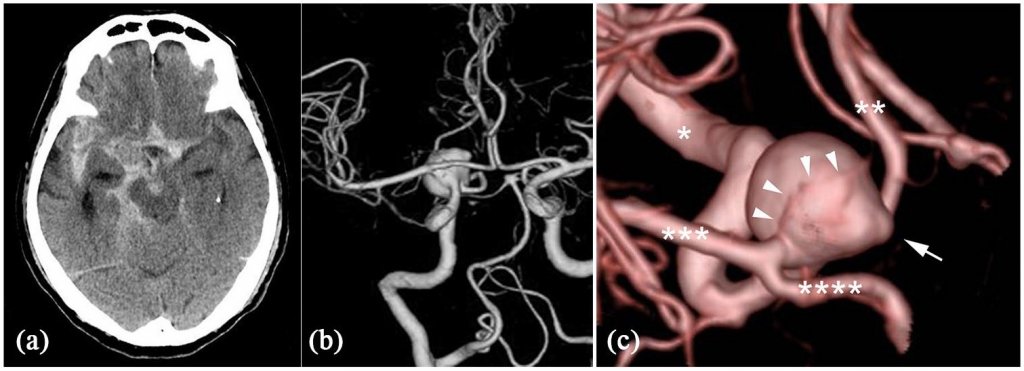 На рисунку: (a) Передопераційна аксіальна КТ, що демонструє САК. (b, c) Тривимірна (3D) реконструйована КТ-ангіограма, що показує велику аневризму IC-PC з пухирцем (стрілка) і праву AChA, що розгалужується біля дистальної сторони аневризми (стрілка).