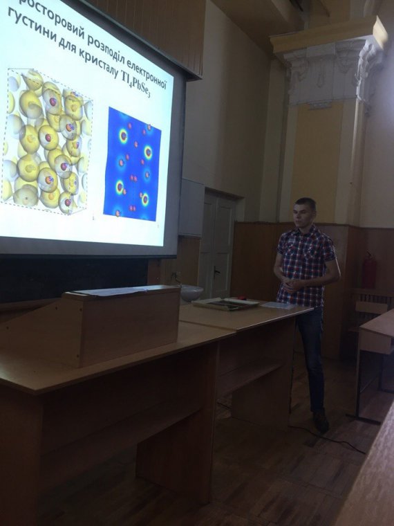 Одну з найбільш цікавих презентацій „Електронна структура та оптичні властивості кристалів SiSe2” представив ст. О. Малець. Підвищений інтерес до склоподібних дихалькогенідів кремнію SiX2 (X = S, Se, Te), активованих літієм і сріблом, обумовлений наявністю в них високої іонної провідності. Завдяки цьому склоподібний диселенід кремнію (SiSе2), активований літієм, є перспективним твердим електролітом для виготовлення нового покоління літій-іонних батарей та акумуляторів. У даній роботі методом теорії функціонала густини виконані оригінальні розрахунки електронної структури, густин станів, розподілу електронної густини і оптичних функцій моноклінної та ромбічної фаз SiSe2.