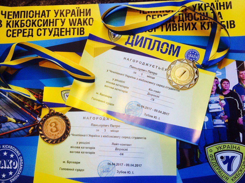 Студенти юридичного факультету Ужгородського національного університету не перестають дивувати і надалі демонструють свої здібності, займаючи призові місця у різних видах діяльності. Сьогодні ми маємо змогу привітати Петра Панькулича – студента третього курсу із здобуттям чергової перемоги у Чемпіонаті України з кікбоксингу серед студентів у розділі кік-лайт та третім місцем у розділі лайт- контак. Чемпіонат відбувся 6 – 9 квітня 2017 року у м. Бровари. За словами очевидців, Петро одразу ж активізувався і завдав цілу серію влучних ударів супернику, тим самим і виборов свою перемогу у ваговій категорії 79 кг. Та найбільше слід пишатися третім місцем, де Петро боровся у вищій ваговій категорії – 84 кг, що не завадило йому виступити як достойний суперник і показати свій високий рівень боротьби та добре відшліфовану майстерність.