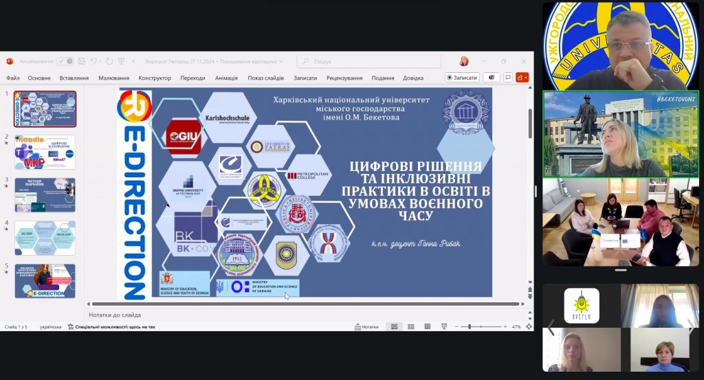 Віталій Андрейко, декан факультету історії та міжнародних відносин ДВНЗ «Ужгородський національний університет» приєднався до вступних слів : «Хочу відзначити, що якраз майже рік, як ми розпочали реалізацію цього проєкту, і досить багато гарних ініціатив було реалізовано. Протягом 2024 року, наш колектив отримав можливість познайомитися з безпосередніми учасниками і нашими партнерами з України, Грузії, Греції та Німеччини. Також відвідали Грузію Грузинський міжнародний університет в Тбіліссі, де був проведений цікавий захід, симпозіум. Протягом трьох днів ми знайомилися, ділилися першим досвідом в рамках зазначеної проблематики. Окрім того, нами протягом цього періоду опрацьовано значний масив нормативної правової бази щодо цифровізації, екологічних питань та інклюзії. Ми дуже раді, що в нашій команді працюють кваліфіковані співробітники, які сприяють успішній реалізації проєкту».