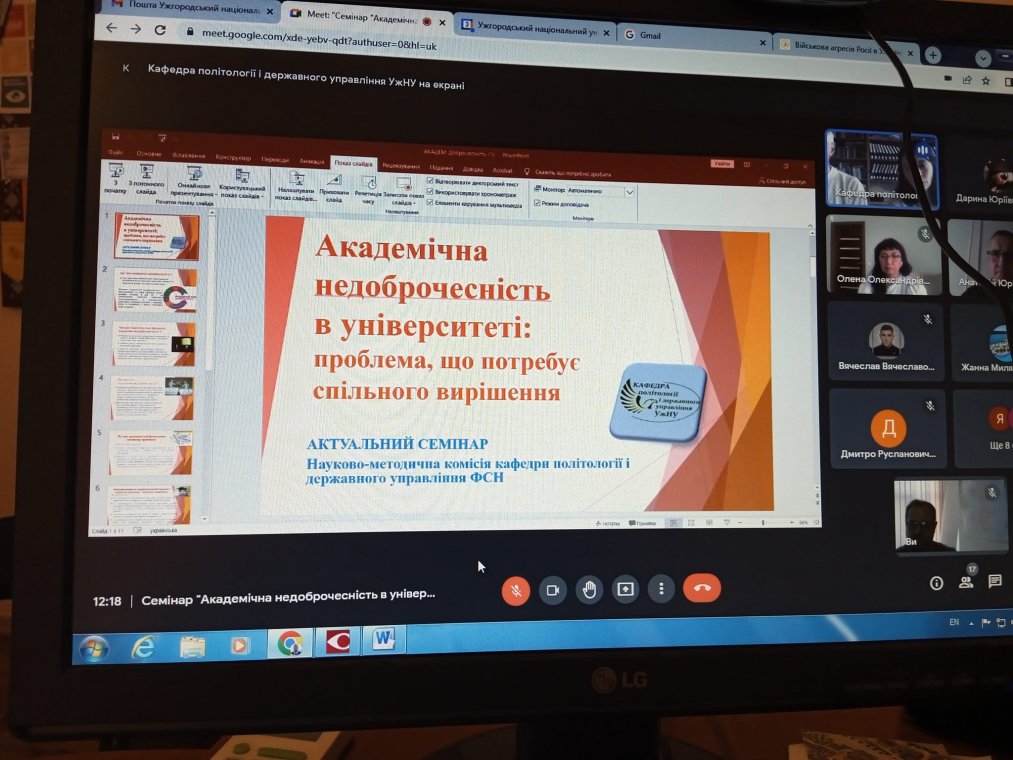 Відкрив онлайн-семінар голова НМК кафедри політології і державного управління професор Маріан Токар, який акцентував увагу на важливості проведення тематичних семінарів на актуальні проблеми сучасного освітньо-наукового процесу на факультеті й представив модераторів даного заходу – доцентів кафедри політології і державного управління, кандидатів політичних наук Надію Кічеру та Віктора Петрінка. Ведучі підготували цікаву програму, яку супроводжували слайдовою презентацією. Вона містила актуальну понятійно-категоріальну, інноваційно-просвітницьку, довідково-статистичну й прикладну інформацію. Модератори ділилися власним досвідом боротьби з академічною недоброчесністю та інноваційними підходами, які продукують останнім часом провідні освітні установи й міжнародні програми. До речі, учасником однієї із так сертифікованих програм була і Надія Кічера.
