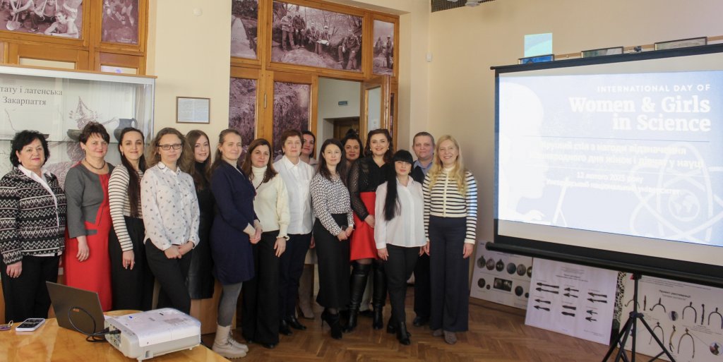 Маріанна Колодій, керівниця Центру гендерної освіти УжНУ, окреслила для присутніх історію та традиції відзначення цього дня, а також основні аспекти щодо представництва та діяльності жінок і дівчат у науці: “До першої пʼятірки країн ЄС з найбільшою кількістю жінок-науковців входять Литва, Болгарія, Латвія, Португалія й Данія. Натомість ОАЕ, Іран, Узбекистан, Японія, Камерун, Саудівська Аравія — країни, в науці яких жінки мають найменше представництво. Серед вчених-дослідників українських наукових установ жінки складають близько 46%, проте тільки 20% із них перебувають на керівних посадах у ЗВО. У світі 30% наукових публікацій та 13% патентів на винаходи належить жінкам. Прогнозується, що гендерної рівності в області винаходів буде досягнуто у 2070 році. У світі серед студентів, що вивчають природничі науки, технологію, інженерію та математику, дівчата складають 35%. У Вікіпедії 15% текстів про науковців, присвячені жінкам-дослідницям”.