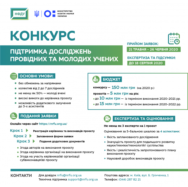 На сайті Національного фонду досліджень відкрито прийом заявок на другий конкурс наукових і науково-технічних проєктів НФД – “Підтримка досліджень провідних та молодих учених”. Податися можна від 21 травня, до 26 червня 2020 року (23:59 за київським часом).