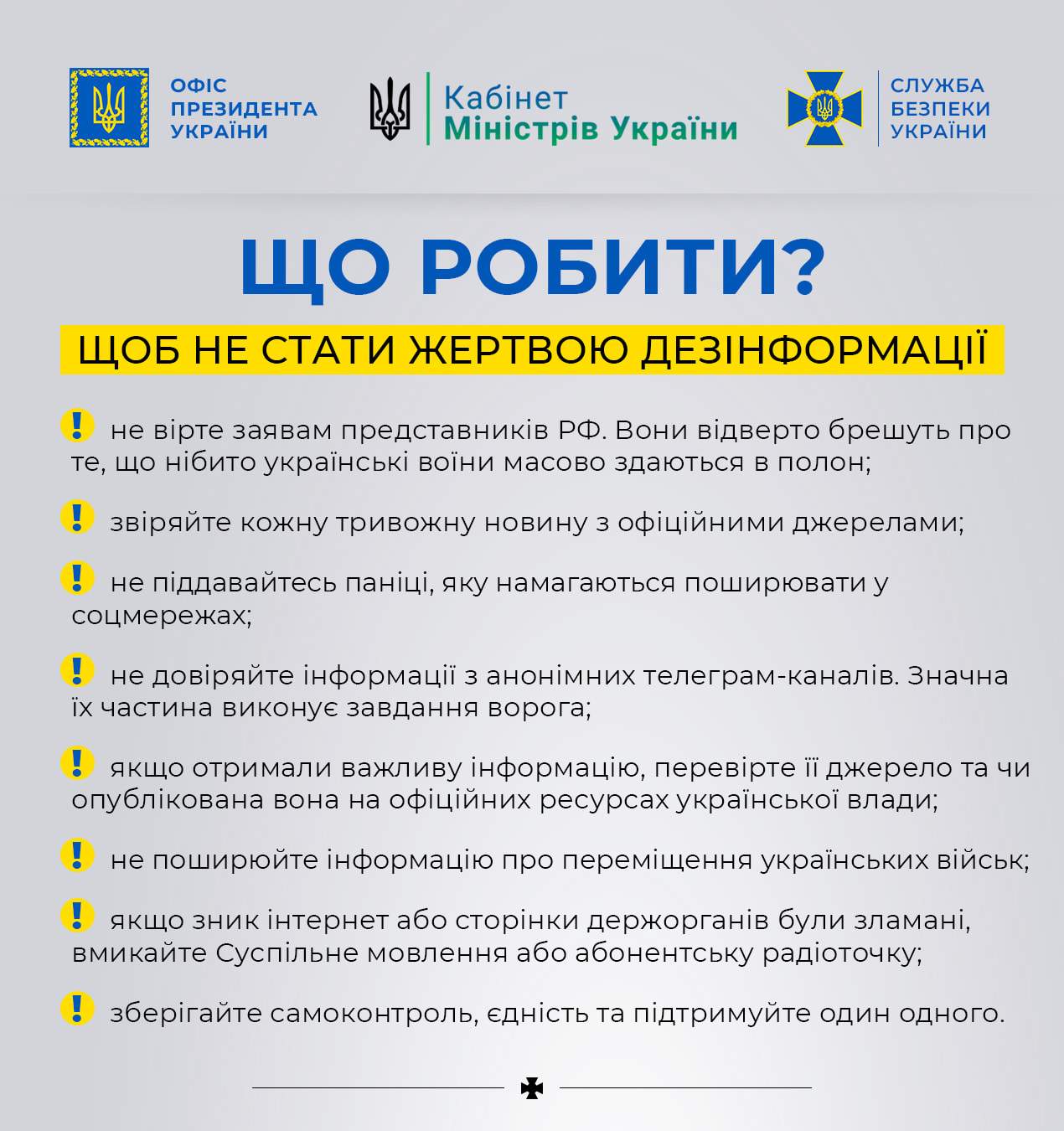 Особливо важливим є останній пункт, оскільки дотримання правил інформаційної гігієни – це питання не тільки психологічного благополуччя, але і національної безпеки. А «фейкові» новини в епоху сучасних технологій поширюються зі скорістю світла. Найкращим варіантом є черпати достовірну інформацію на офіційний сторінках Офісу Президента України, Міністерства оборони України, Генерального штабу ЗСУ, Державної прикордонної служби України, Міністерства внутрішніх справ.