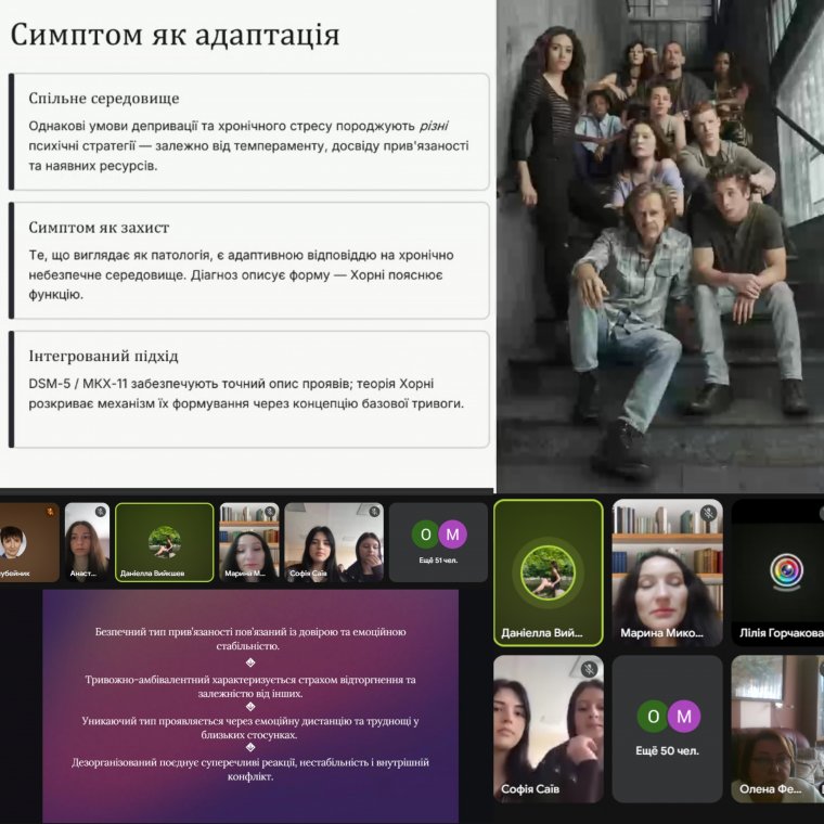 Замість традиційних доповідей майбутні фахівці спеціальності 053 Психологія публічно представляють свої науково-практичні дослідження, виконані в рамках курсових проєктів за програмою дисципліни «Особистість в теорії та практиці клінічної психології», у форматі вебінарів. Вже другий рік поспіль головними «клієнтами» для аналізу стають герої відомих молодіжних серіалів, художніх та документальних фільмів. Цього разу через теорію прихильності Джона Боулбі було розкрито вплив емоційного зв’язку з батьками на соціальний розвиток дитини за серіалом «Ейфорія», у межах теорій Карен Хорні та Джона Боулбі було проаналізовано особливості розвитку підлітків із неблагополучних родин за матеріалами фільму «Безсоромні».
