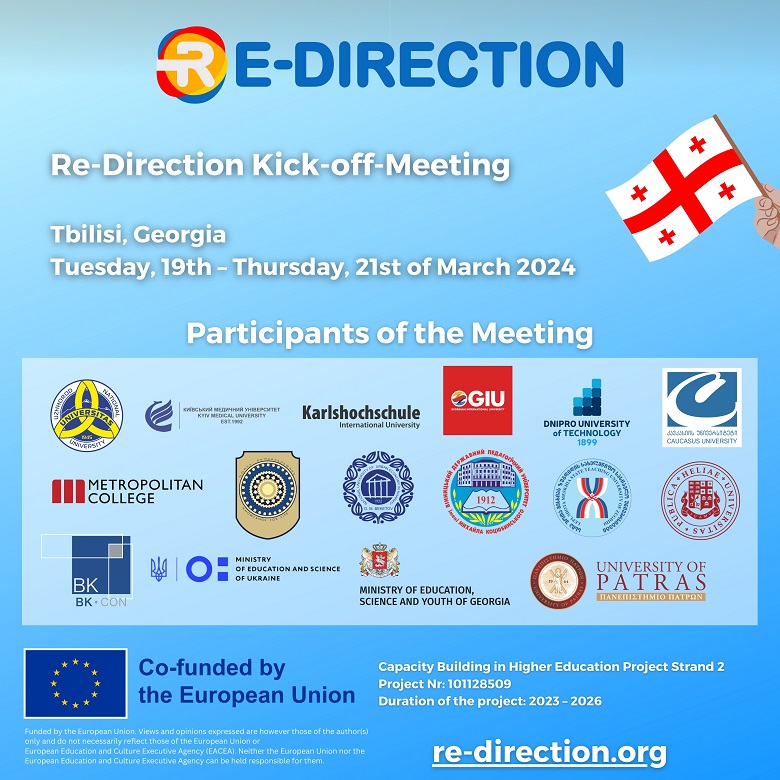 Інноваційний проєкт RE-DIRECTION, який співфінансується ЄС і підтримується консорціумом міжнародних партнерів, розпочав свою стартову зустріч з 19 по 21 березня 2024 року. Ця амбітна ініціатива під егідою програми Erasmus+ спрямована на революціонізацію цифрового ландшафту вищої освіти в Україні та Грузії.