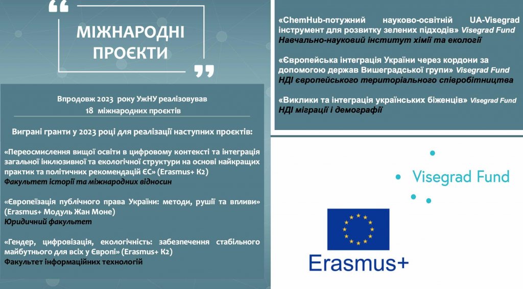 Упродовж 2023 року УжНУ активно співпрацював з 150 закордонними партнерами, було укладено 15 нових міжнародних міжінституційних угод. Також впродовж 2023 року УжНУ реалізовував 18 міжнародних проєктів.