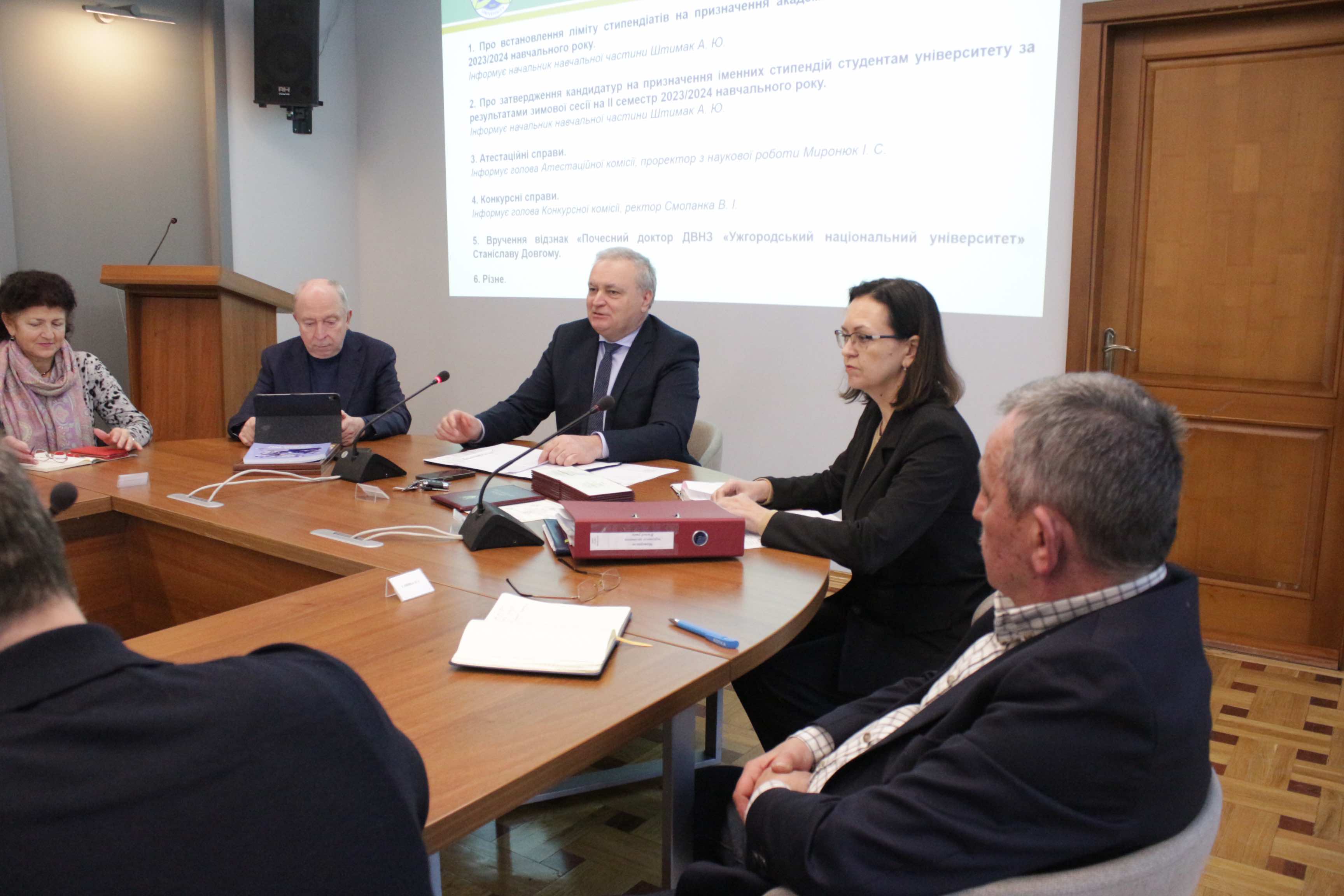 У вівторок, 30 січня, в Ужгородському національному університеті відбулося чергове засідання Вченої ради. На розгляд були винесені конкурсні та атестаційні справи, вручення відзнаки «Почесний доктор ДВНЗ «Ужгородський національний університет» академіку НАН Станіславу Довгому а також низка інших важливих питань.