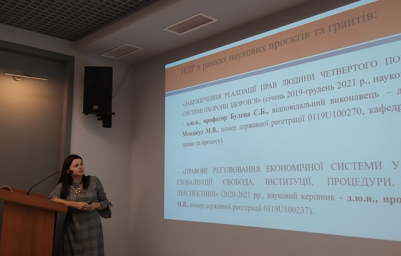 Із доповіддю про наукову роботу юридичного факультету (2021 –2022 рр.) виступила заступник декана з наукової роботи д.ю.н., професорка Марія Менджул. Вона ознайомила із науковими заходами, що проходили на факультеті, реалізованими міжнародними науковими проєктами, студентською науковою роботою та публікаційною активністю науково-педагогічних працівників. Також Марія Менджул представила плани юридичного факультету на 2023 рік, в яких зазначалось про активізацію наукової діяльності студентів, аспірантів та молодих вчених; сприяння науковому стажуванню та обміну досвідом із закордонними партнерами; організацію щонайменше 5 наукових та науково-практичних заходів; взяття участі у конкурсах наукових проєктів.