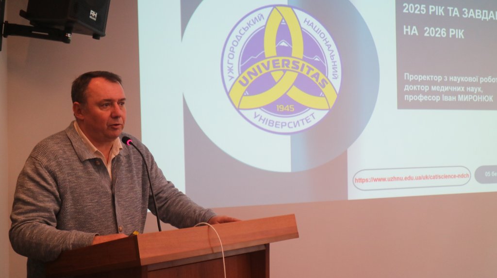 Про результати наукової роботи університету за 2025 рік та завдання на 2026-й проінформував проректор з наукової роботи Іван Миронюк. У доповіді він відзначив найвагоміші наукові здобутки університету. Зокрема, УжНУ атестовано за трьома науковими напрямами: природничо-математичним (категорія А), біомедичним (категорія Б) та суспільним (категорія В). Серед важливих досягнень — затвердження Стратегії розвитку ДВНЗ «Ужгородський національний університет» на 2025–2032 роки, перше місце університету в рейтингу інституційних репозитаріїв України, впровадження нової рубрики «Заявка на супровід наукового/інноваційного проєкту», а також включення журналу «Ukraine. Nation's Health» до наукометричної бази Scopus. Окрім того, відзначено позитивну динаміку у сфері проєктної діяльності: кількість проєктів-переможців науково-дослідних робіт зросла та перевищила кількість завершених проєктів.