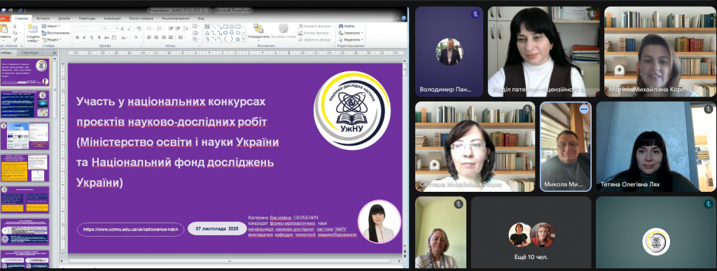 7 листопада 2025 року на факультеті міжнародних економічних відносин Ужгородського національного університету відбувся перший вебінар «Участь у національних конкурсах проєктів науково-дослідних робіт (Міністерство освіти і науки України та Національний фонд досліджень України)». Вебінар проведено в межах плану заходів, спрямованих на розвиток наукової діяльності, зокрема активізацію участі у поданні проєктів на національні конкурси, підвищення обізнаності у сфері грантової підтримки, захисту авторських прав на результати наукових досліджень, розвиток стартап-підприємництва та впровадження принципів відкритої науки.Організаторкою заходу виступила Марина Король, докторка економічних наук, професорка кафедри міжнародних економічних відносин, заступниця декана факультету міжнародних економічних відносин з наукової роботи.