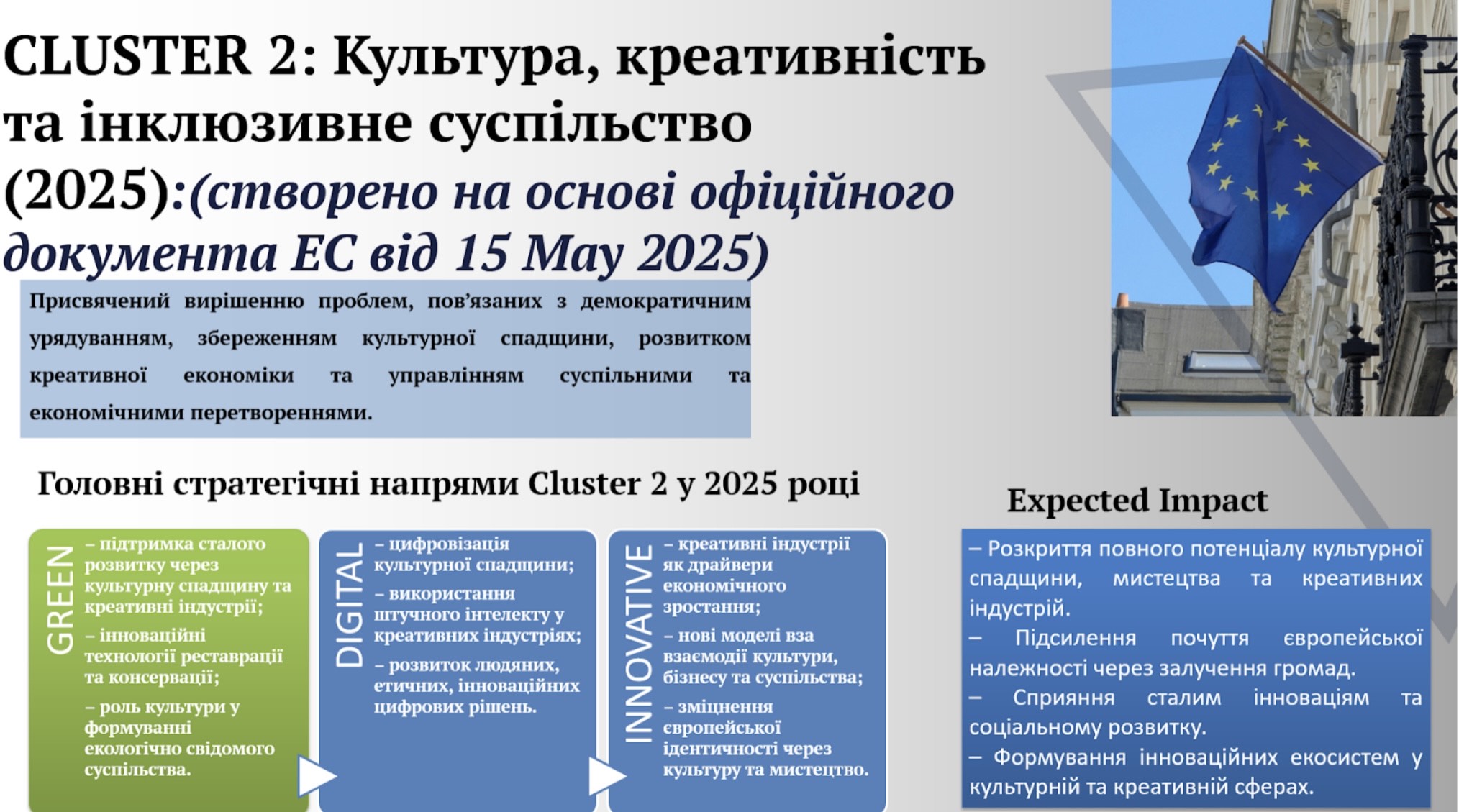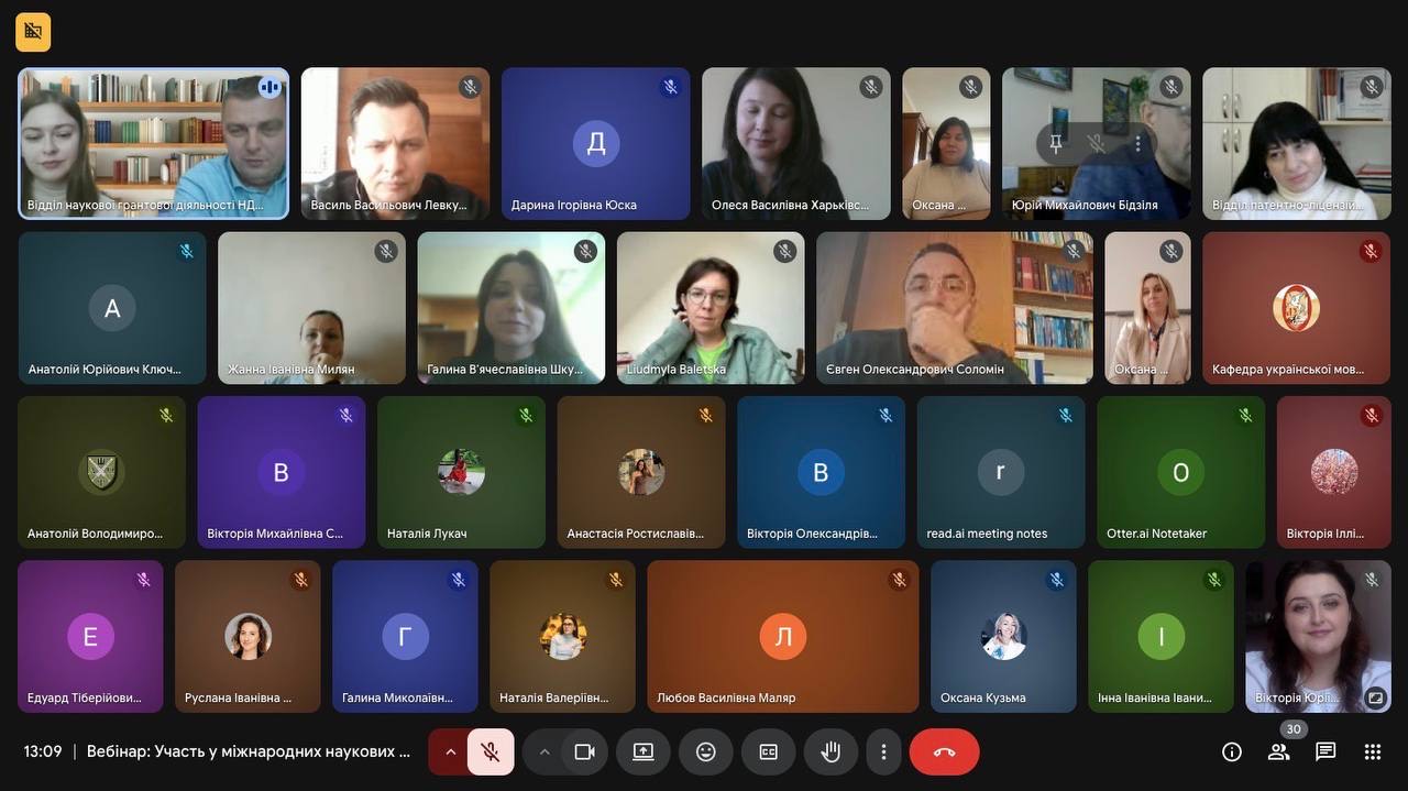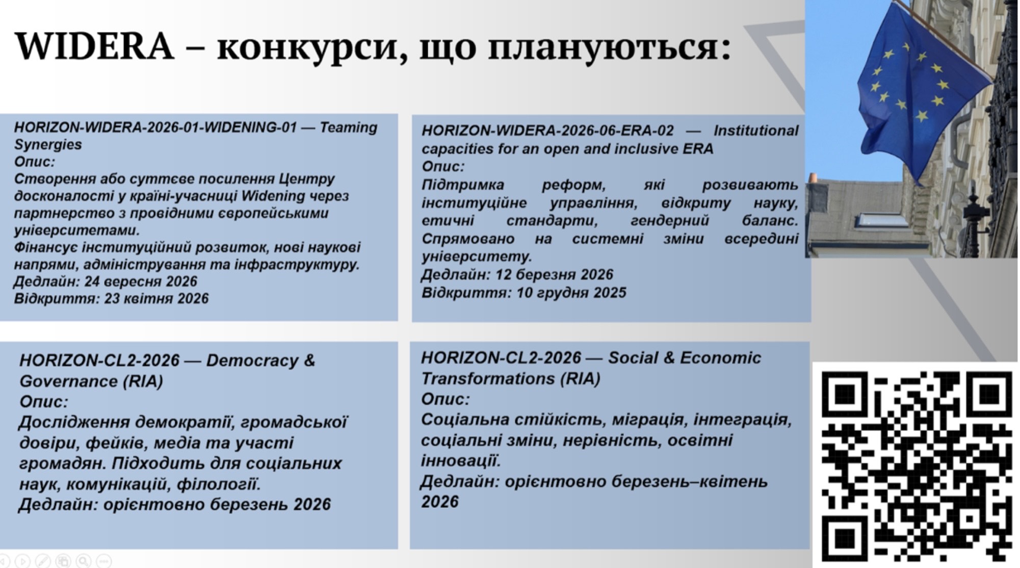 Доповідачами вебінару були Віталій Сержанов, доктор економічних наук, доцент, начальник відділу наукової грантової діяльності, та Інга Бесеганич, провідний інженер цього ж відділу. У своїх виступах вони детально ознайомили учасників із можливостями участі у провідних міжнародних грантових програмах Європейського Союзу, зокрема Horizon Europe, WIDERA та EIT. Спікери роз’яснили ключові особливості конкурсів програми «Горизонт Європа» для соціальних і гуманітарних наук, вимоги до формування міжнародних консорціумів, етапи реєстрації й подання проєктних пропозицій, а також типові помилки, яких варто уникати під час підготовки заявок. Окрему увагу було приділено інструментам WIDERA, що спрямовані на розвиток інституційної спроможності та створення центрів досконалості, а також можливостям програм EIT, орієнтованих на підтримку інноваційних освітніх і наукових рішень у галузі культурних та креативних індустрій.