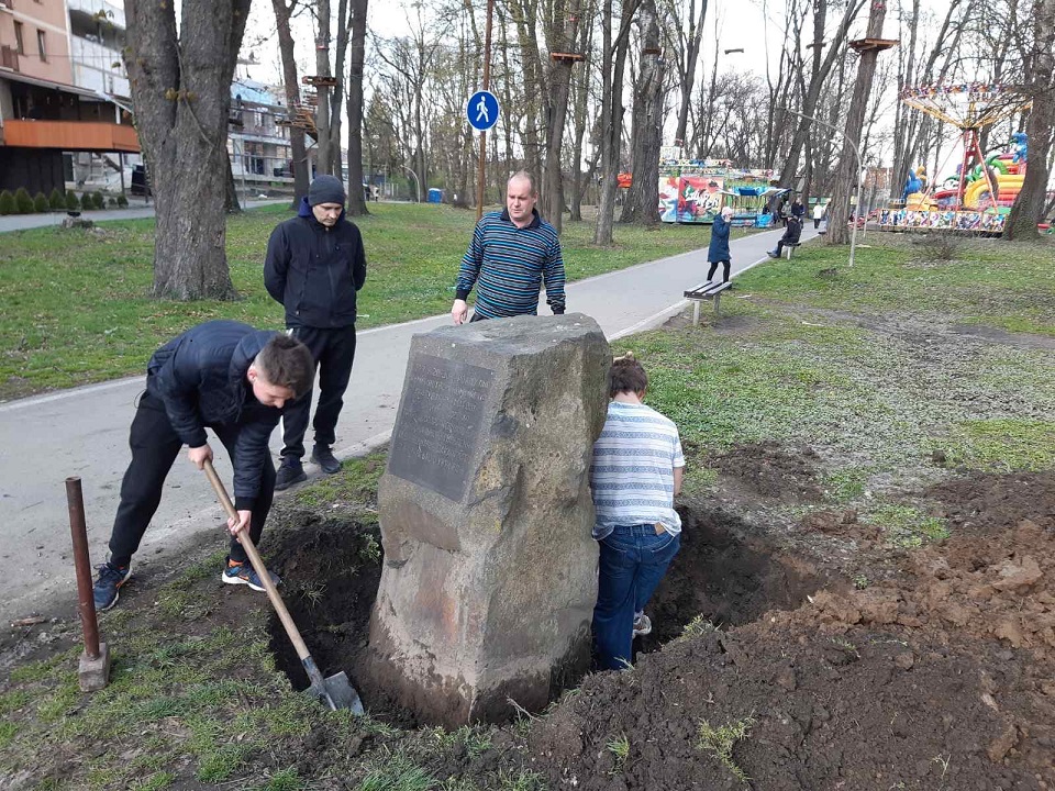 - Під час волонтерської роботи в університеті я зустрів Олексія Шафраньоша, працівника Інформаційно-видавничого центру УжНУ, і в розмові виникла ця ідея. Адже після перших російських ударів по Києву, Харкову, Волновасі, й інших містах такий пам’ятник про «возз’єднання України з Росією» виглядав украй дивно. Тоді почала формуватися наша ініціативна група, до нас долучились журналіст Станіслав Данко, випускник історичного факультету Іван Логай і юрист з Києва Сергій Мартинов. Ми не є «вандалами», тому першочергово звернулися в міську раду, з якої нам прийшла відповідь¸ що такого пам’ятника на балансі взагалі немає. До того ж, міська рада надала нам екскаватор. Ця подія викликала позитивний резонанс – на ранок мені телефонували, дякували, з’явились новини на сайтах, які люди активно поширювали. Це радує, адже ми боремося не з камінням, а з ідеологією, з тим, що у людей у голові. З іншого боку, такі події творять базу для роботи відповідних структур, адже ділять людей на тих, хто «за», нейтральних, і які різко «проти». Через кілька днів нам написали, що наша група недопрацювала, адже в парку є ще один пам’ятник – значно більший і на ту ж тематику. Згодом ми виявили ще монументи, які мали вкрай комуністичний характер. До нас долучились й інші активісти. Також хочу зазначити, що це не є основним нашим напрямком. Передусім, особисто я – працюю в університеті, також ми займаємося волонтерством, недавно я повернувся зі Сходу, і у вільний час ми, звісно, не можемо пройти повз, наприклад, таблички «наб. Московська» у нашому місті. Плануємо всі ці вивіски й монументи не викидати, а зробити експонатами майбутнього Музею тоталітаризму.