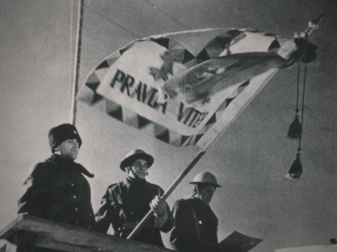 Під час складання присяги. Полковник генерального штабу Геліодор Піка, прапороносець батальйону сержант Освальд Шафаржік із прапором батальйону та полковник Людвік Свобода. Бузулук, 27 січня 1943 рік